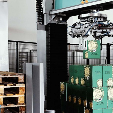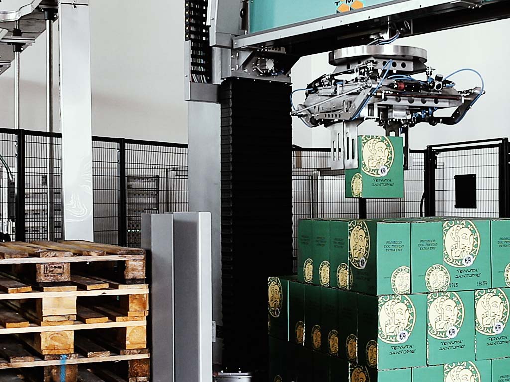 Grâce à des pinces de préhension dédiées, le produit est prélevé d’une bande/convoyeur à rouleaux d’alimentation et déposé sur la palette, suivant le schéma de palettisation sélectionné. La machine est gérée par PLC et, grâce à l’utilisation d’un panneau IHM à Écran Tactile intuitif, l’opérateur peut contrôler chaque fonction.