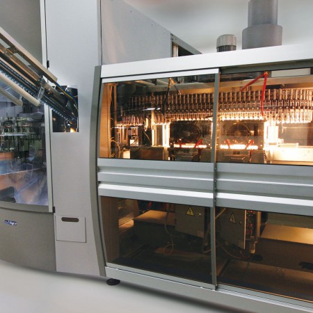 Alimentaire, Jus et Detergents. Voila les avantages principaux: - plus souple: la nouvelle barre d'étirage complètement motorisée autorise une gestion facile du changement de format, grâce au meilleur contrôle du cycle de soufflage et du processus d'étirage (maintenant il est 20% plus rapide : de 1,8 m/s à 2,2 m/s) - plus durable: le processus électronique d'étirage a éliminé la nécessité de cames, tout en réduisant le niveau de stress par vibration des composants mécaniques - plus performante: le temps de soufflage de la roue a été réduit, ce qui entraîne un meilleur rendement de 17% de la souffleuse. Avec des bouteilles de 5 L, un seul moule atteint une cadence jusqu'à 1.200 bph - moins de gaspillage : à présent, le four contient 50% de préformes en moins, ce qui implique un convoyeur de déchargement plus court, à utiliser pour vider la machine en cas d'arrêt en urgence |