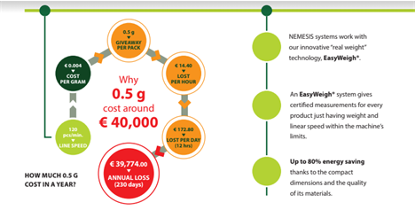 Le poids varie de 15 g à 8 kg et les vitesses atteignent jusqu'à 400 produits par minute.