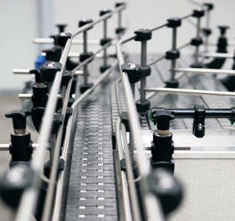 Les guides latéraux sont fabriqués avec un profilé en polyéthylène haute densité adapté pour protéger le contenant et l'étiquette. Alternativement, des tubes en acier inoxydable ou des plaques plates sont installés pour guider des bouteilles de plus grandes tailles, des gallons ou divers contenants.