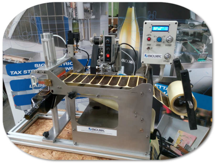 etc. La machine peut appliquer des étiquettes de toutes tailles d’une hauteur maximale de 160 mm. Un système constitué d'une plaque commandée par un cylindre pneumatique prélève l'étiquette et la presse contre la bouteille. La plaque est munie d’ un caoutchouc particulièrement épais qui suit les courbes du container. Ce système permet un étiquetage parfait, sans le moindre pli, y compris des conteneurs ayant une superficie non plate et avec des étiquettes ayant un faible coefficient de dilatation ( étiquettes en plastique – transparentes, etc….). |