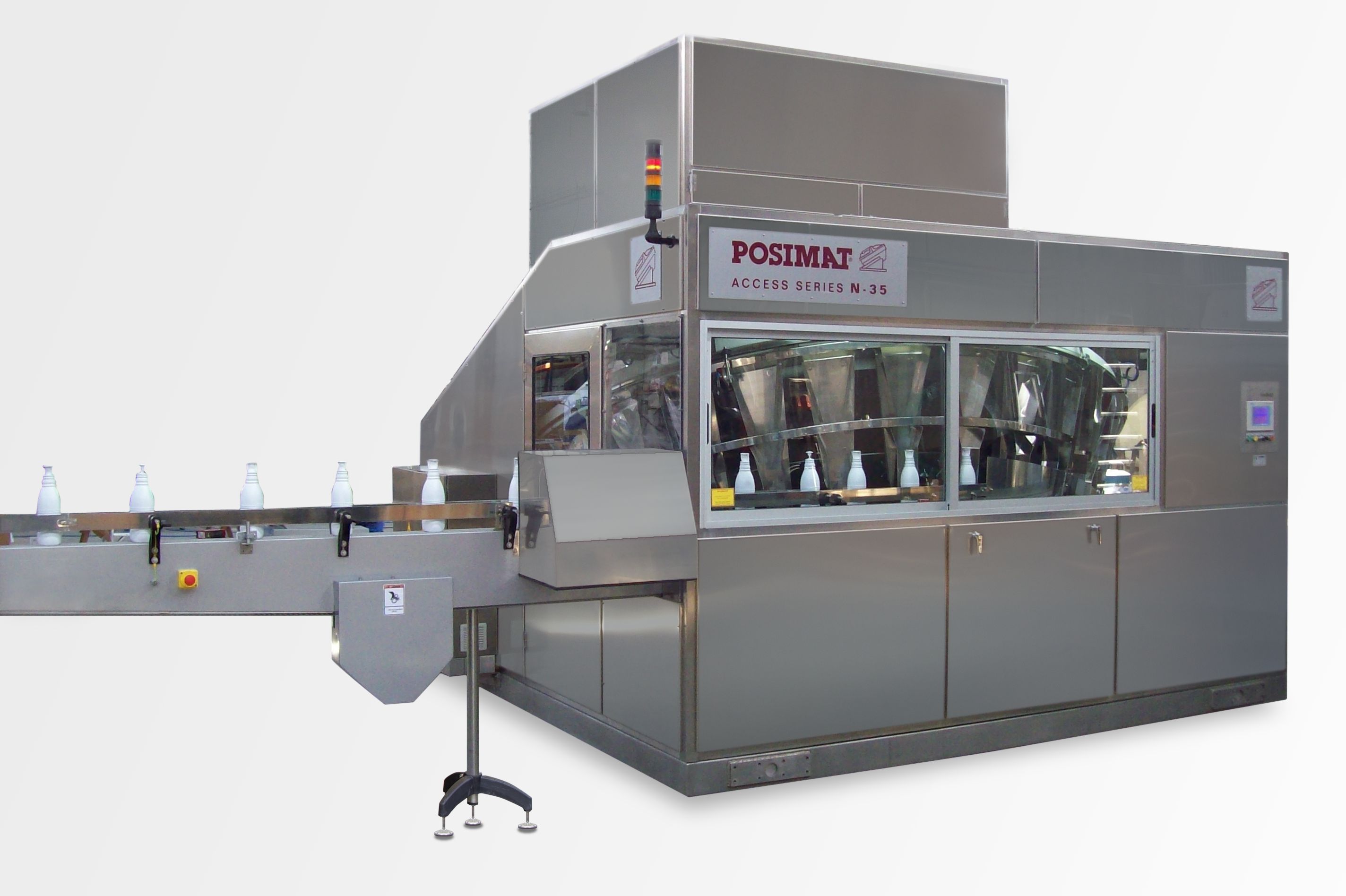 vides sur des convoyeurs. Toutes sortes de bouteilles: légères ou lourdes, cylindriques, ovales ou asymétriques, à cols courts ou même sans col, éléments plats comme des couvercles ou des bouchons, avec ou sans étiquette, etc. Vitesses de 2 000 à 80 000 bouteilles par heure. |