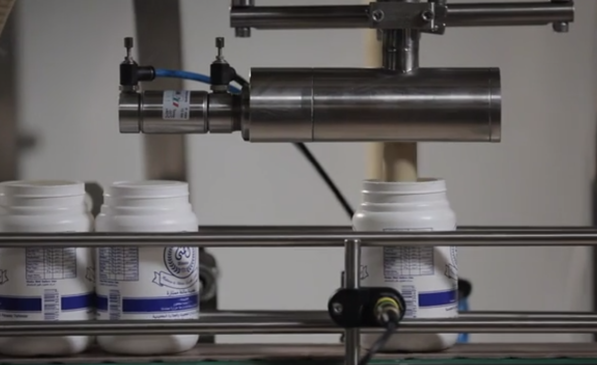 alimentaire, par exemple. Les recipients peuvent etres des bouteilles ou bien des pots en plastique. La machine est entièrement construite en acier inoxydable AISI 304. Remplissage volumétrique au moyen de 4 doseurs a piston de 80g à 640g. chacun pour une vitesse moyenne de 4,000 pots par heure. Autres niveaux de remplissage et vitesses sont disponibles selon la requete du client. Characteristiques techniques: - Contrôle directionnel de la vanne pneumatique garantissant une précision de dosage parfaite à chaque course de remplissage - Capacité de remplissage réglable au moyen d'une roue filetée avec référence à l'échelle graduée - Vanne automatique pour la fermeture du passage du liquide - Vanne manuelle pour la distribution de liquide pour la vidange de la trémie - Tous les composants électriques de la machine installés à l'intérieur de l'armoire sous-jacente, accessibles uniquement par la porte de sécurité - Armoire de protection anti-poussière avec portes en plexi transparent sur les côtés avant et arrière avec poignées et couvercles sur les deux côtés latéraux, avec ouvertures de passage des produits - Interrupteurs de sécurité - Espacement automatique des produits par porte pneumatique - Machine de remplissage gérée par PLC - Tetes de remplissage facilement démontables pour un nettoyage parfait |