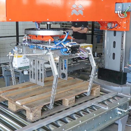 Grâce à des pinces de préhension dédiées, le produit est prélevé d’une bande/convoyeur à rouleaux d’alimentation et déposé sur la palette, suivant le schéma de palettisation sélectionné. La machine est gérée par PLC et, grâce à l’utilisation d’un panneau IHM à Écran Tactile intuitif, l’opérateur peut contrôler chaque fonction.