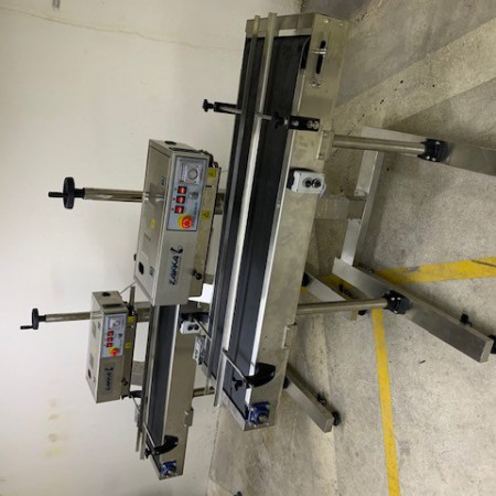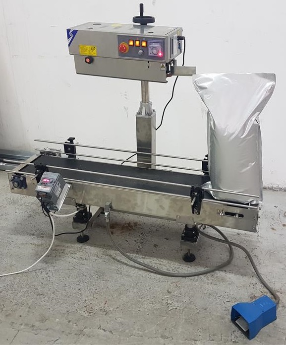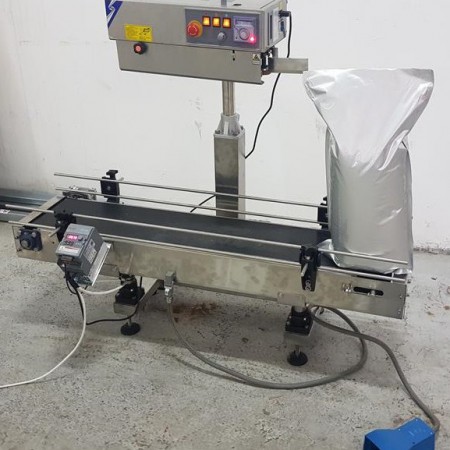 thermoscellables. Elle se distingue par son extraordinaire flexibilité d'utilisation et guarantie une largeur de scellage de 15 mm sur les sacs en PE, Polyester-PE, AL-PE, PA-PE. Conçue pour être la station de scellage dans les lignes d'emballage automatiques, ou utilisée comme thermoscelleuse indépendante. Vitesse maximale jusqu'à 20 mt / min, double contrôle de la température a travers des régulateurs de température numériques, refroidissement par air forcé, réglage de la pression du joint. Versions: montées sur support avec convoyeur de sacs intégré, sur support sans convoyeur, tête de scellage uniquement. Applications: aliments, aliments surgelés, café, produits chimiques, produits pharmaceutiques, aliments pour animaux de compagnie. |